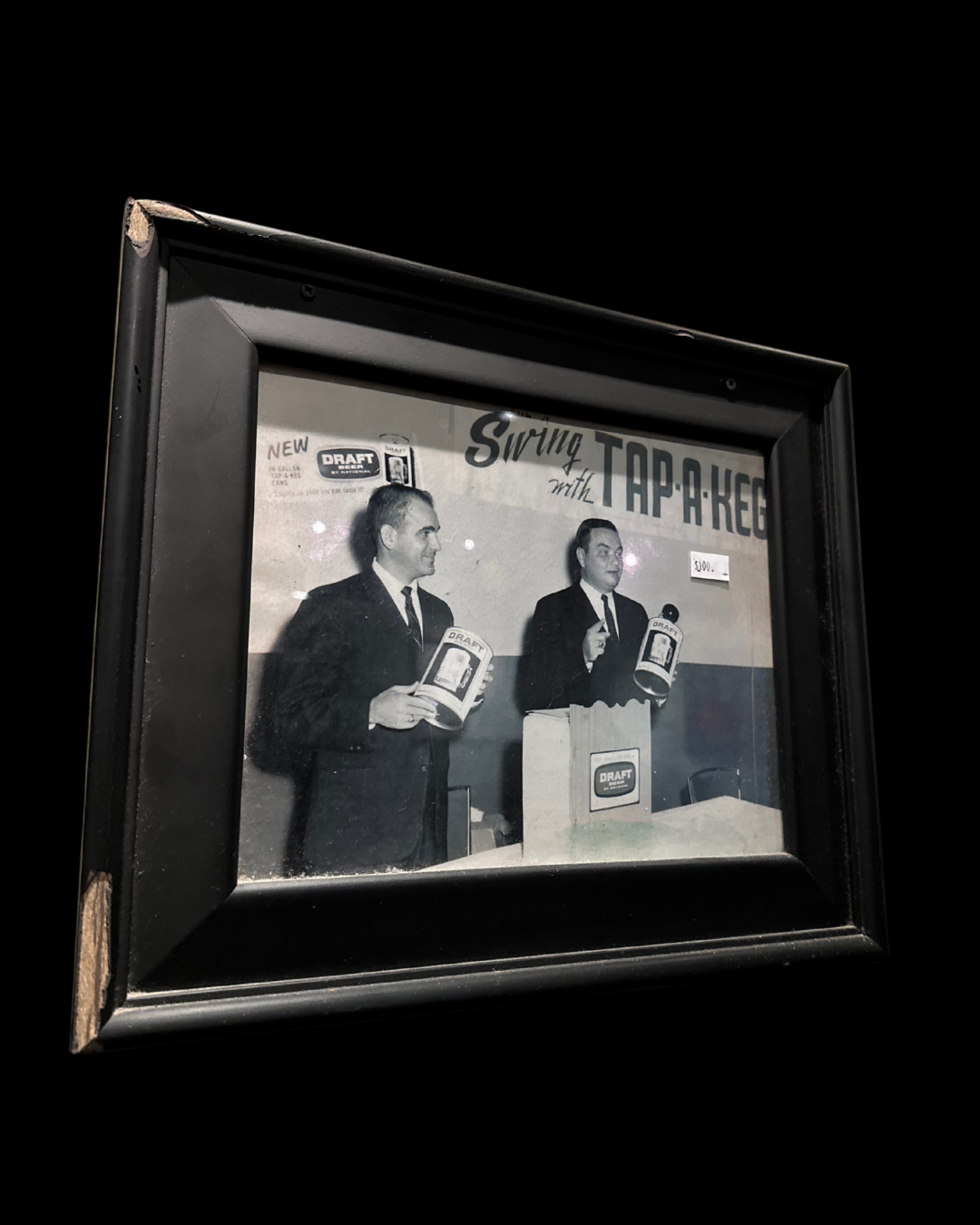 Black and white photo of men launching tap-a-keg. From the Nacho Mama's collection.