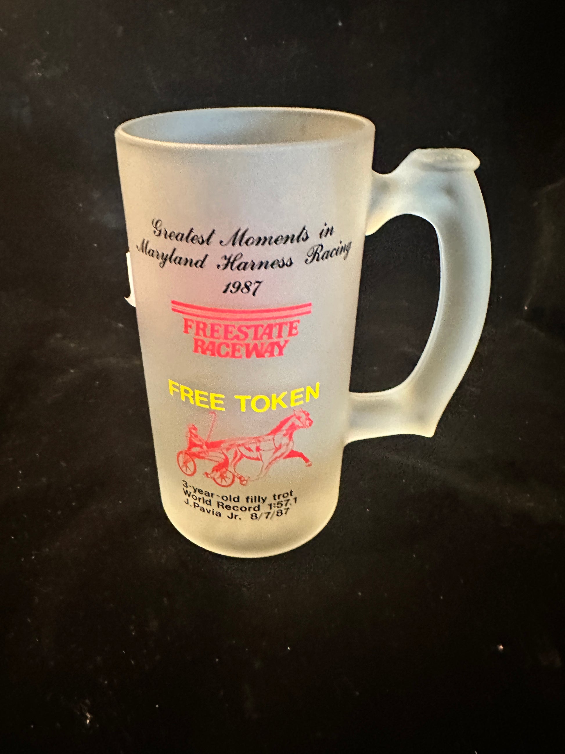 Tall mug made for Maryland Harness Racing 1987, featuring Freestate Raceway moment when 3-year-old filly trot World Record (J. Pavia Jr.) 8/7/87. Made by National Premium, with logo in black and red